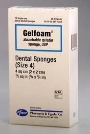 Sterile absorbable gelatin sponge, for use in oral surgery providing hemostasis. May be used either dry or moistened. Should not be used in closure of incisions because of interference with healing.