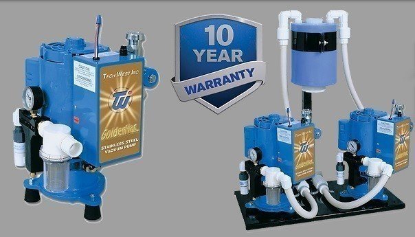 Tech West GoldenVac has proved to be the industry leader in design and performance. A vacuum system you can rely on for years to come. All GoldenVac vacuum pumps have an exclusive warranty with 10 years on all stainless steel pump components, 5 years on the motor shaft and all other components have 3 years. The GoldenVac vacuum pumps have an investment cast stainless steel impeller with a radical new design that improves performance. The stainless steel castings provide maximum durability to prevent wear from air abrasion and ceramic particles, or hard water conditions. All motors are thermally protected and are cap-start, cap-run. This will lower the electrical consumption of the pump. Water recyclers and air-water separators are available for all pumps. The GoldenVacs are available in single, dual, or triple configurations. Tech West will provide plumbing and electrical designs upon request.