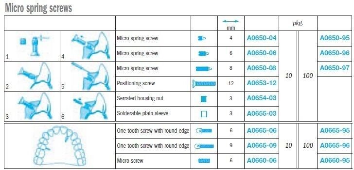 HomeDental SuppliesOrthodontic SuppliesOrthodontic ExpandersOrthodontic Micro Spring ScrewsMicro spring screws – Leone Micro spring screws – Leone$12.99 – $359.99Price range: $12.99 through $359.99 Stainless steel keys Reamer It is used to tap holes into acrylics. Suitable for all expansion screws with 0,4 mm pitch. Refill tip A0669-00. Micro spring screws - Leone Choose an optionStainless steel keys 45 bent tipScrewdriverSafety ring leashReamerStainless steel keys straightMicro spring screw kit Including 15 micro spring screws, 10 housing nuts, 15 positioning screws, reamer and screwdriverMicro screw pkg 100Micro screw pkg 10One-tooth screw with round edge 9mm pkg 100One-tooth screw with round edge 9mm pkg 10One-tooth screw with round edge 6mm pkg 100One-tooth screw with round edge 6mm pkg 10Solderable plain sleeve pkg 10Serrated housing nut pkg 10Positioning screw pkg 10Micro spring screw 8mm pkg 100Micro spring screw 8mm pkg 10Micro spring screw 6mm pkg 100Micro spring screw 6mm pkg 10Micro spring screw 4mm pkg 100Micro spring screw 4mm pkg 10Clear Micro spring screws - Leone quantity Buy now SKU: SKU8320 Category: Orthodontic Micro Spring Screws Product ID: 172622 Related products MIM® activator tube for extraoral facebow – Leone $74.99 Buy now This product has multiple variants. The options may be chosen on the product page