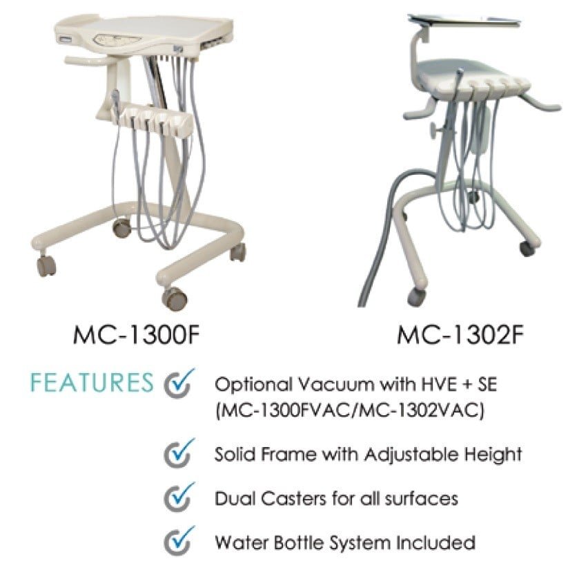 Doctor’s Cart is a mobile doctor’s cart is suited to meet your basic dentistry needs. It has comes standard with individual air and water control as well as a self-contained water bottle system and a city/water bottle selector switch. The smooth rolling dual wheel casters makes this easy to use and control in the dentist’s office. It’s straight asepsis tubing and purge system for hand piece allows this to be used for both dental, orthodontic, hygiene and veterinary use.