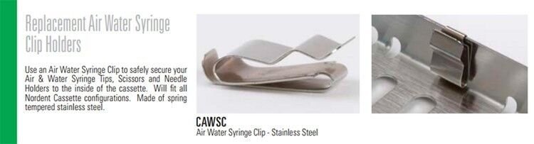 Use an Air Water Syringe Clip to safety secure your Air & Water Syring Tips, Scissors and Needle Holders to the inside of the cassette